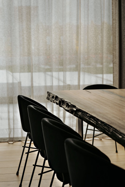 Nie sposób nie wspomnieć o unikalnym stole z blatem z czarnego dębu, który powstał specjalnie na zamówienie. Ten mebel to prawdziwy majstersztyk i jeden z najbardziej charakterystycznych elementów wyposażenia.